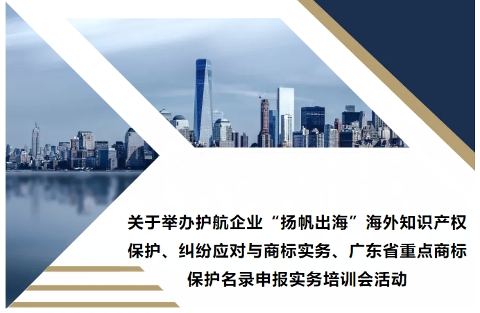 • 關(guān)于舉辦護航企業(yè)“揚帆出海”海外知識產(chǎn)權(quán)保護、糾紛應(yīng)對與商標實務(wù)、廣東省重點商標保護名錄申報實務(wù)培訓(xùn)會活動